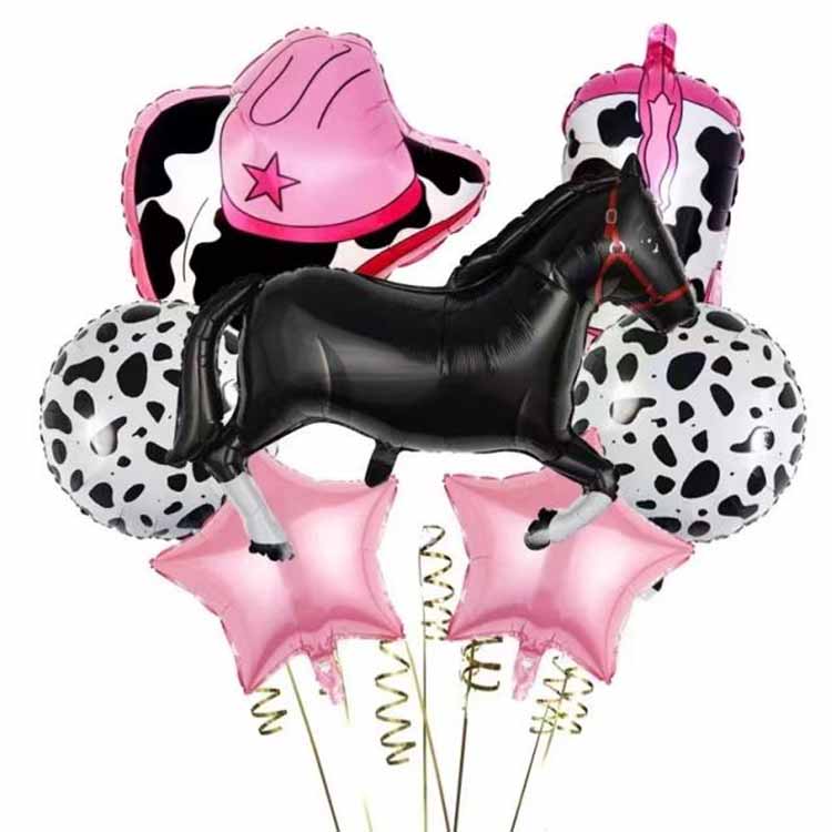 ఖచ్చితమైన రేఖ ఆకృతులు మరియు రంగు సరిపోలికతో, అవి పరుగెత్తే గుర్రాల యొక్క కండరాల ఆకృతులను మరియు ప్రవహించే మేన్లను పునరుద్ధరిస్తాయి మరియు గోధుమ మరియు నలుపు వంటి సాధారణ సహజ రంగు పథకాలు గుర్రాల వాస్తవ చిత్రానికి బాగా సరిపోతాయి. కొన్ని కౌబాయ్ నేపథ్య రేకు బుడగలు దృశ్య ప్రభావాన్ని పెంచడానికి వెండి మరియు బంగారం వంటి లోహ రంగులను కూడా జోడిస్తాయి; ఆవు నమూనా వృత్తాకారంగా ఉంటుంది, దానిపై నలుపు మరియు తెలుపు ఆవు నమూనాలు ముద్రించబడ్డాయి మరియు కొన్ని శైలులు చిన్న గంటలు మరియు ప్లూ వంటి కొన్ని త్రిమితీయ అలంకరణలను జోడిస్తాయి.అల్యూమినియం ఫాయిల్ బెలూన్ల క్రింద sh టెయిల్లు ఉన్నాయి, ఇవి అందమైనవి మరియు గ్రామీణ శైలిని కలిగి ఉంటాయి మరియు కుటుంబాల కోసం కౌబాయ్ కార్యకలాపాలకు బాగా ప్రాచుర్యం పొందిన థీమ్.