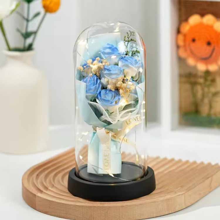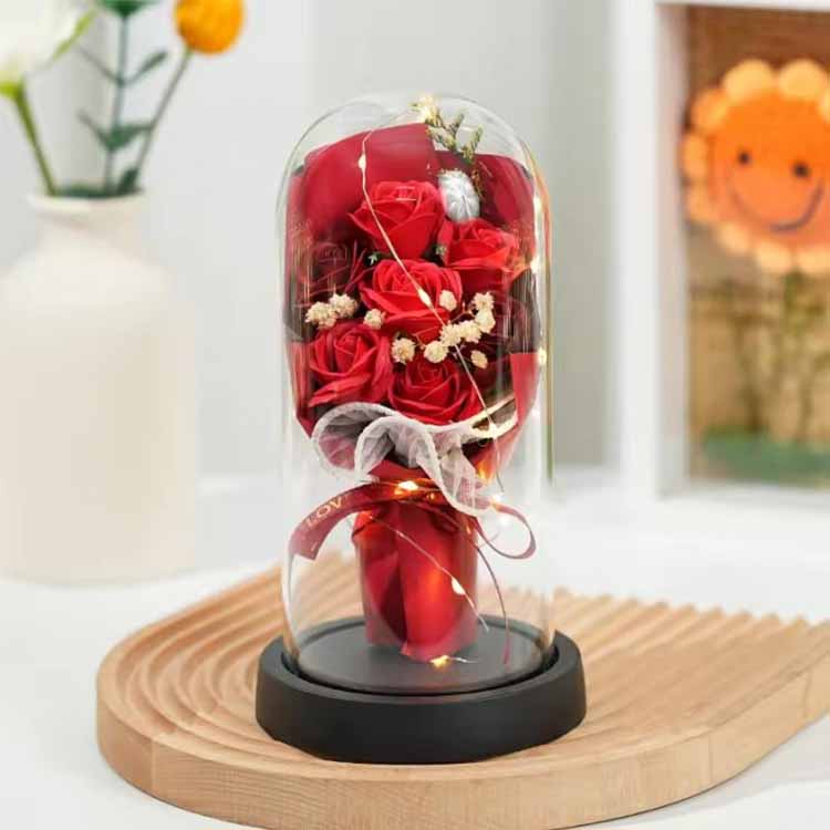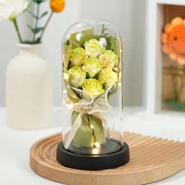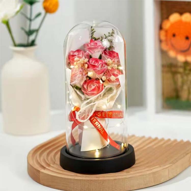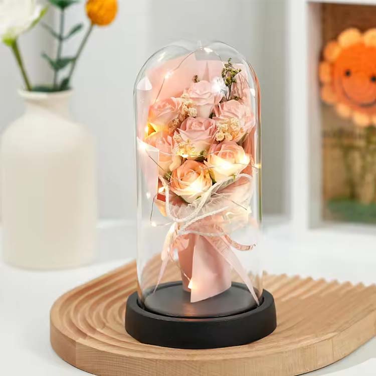 LED గిఫ్ట్ బాక్స్తో కూడిన మా గ్లాస్ డోమ్ సబ్బు గులాబీ గుత్తి సెంటిమెంట్ అర్థంతో ఆచరణాత్మక కార్యాచరణను మిళితం చేస్తుంది, ఇది విలువైన బహుమతిగా మారుతుంది. మీరు మీ ఇంటికి రొమాన్స్ని జోడిస్తున్నా లేదా ఎవరికైనా ప్రత్యేక బహుమతిని పంపినా, అది వెచ్చని మరియు మరపురాని బహుమతి.