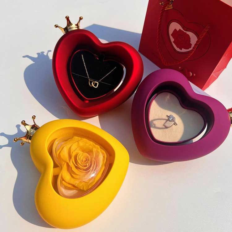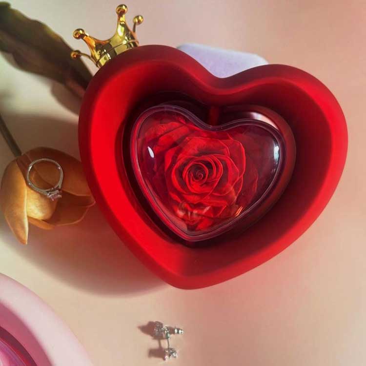 హార్ట్ షేప్ రోజ్ జ్యువెలరీ బాక్స్ గ్రేడ్ A సంరక్షించబడిన పువ్వులను ఉపయోగిస్తుంది, దీని రంగు మరియు ఆకృతి తాజా పువ్వుల నుండి వేరు చేయలేవు.