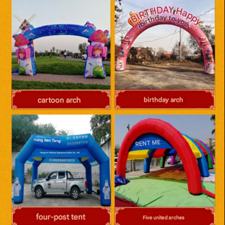 పరిమాణం మరియు ఆకారం: వివిధ పరిమాణాలు మరియు డిజైన్లలో లభిస్తుంది - క్లాసిక్ వంగిన తోరణాలు, కస్టమ్ ఆకారాలు (లోగోలు, కార్టూన్ అక్షరాలు వంటివి), డబుల్ గాలితో కూడిన తోరణాలు లేదా నేపథ్య శైలులు (వివాహం, క్రీడలు, పండుగలు).