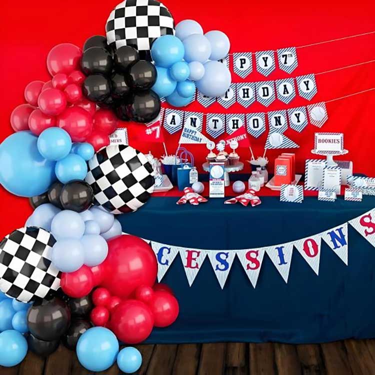 రేసింగ్ థీమ్ బెలూన్ ఆర్చ్ డెకరేషన్ కిట్ అనేది రేసింగ్ నేపథ్య పార్టీలు, ఈవెంట్లు మరియు పుట్టినరోజు పార్టీల కోసం ప్రత్యేకంగా రూపొందించబడిన అలంకార పరిష్కారం. ఈ ఉత్పత్తి కార్ రేసింగ్ థీమ్ చుట్టూ కేంద్రీకృతమై ఉంది. నలుపు, వెండి, నీలం మరియు ఎరుపు రబ్బరు పాలు బెలూన్లు, అలాగే కార్లు మరియు రేసింగ్ ఉపకరణాల నమూనాలను జోడించడం ద్వారా, ఇది ఈవెంట్ వేదిక కోసం ఉద్వేగభరితమైన మరియు ఉల్లాసకరమైన వాతావరణాన్ని సృష్టించి, అలంకరణగా ఒక వంపు ఆకారాన్ని రూపొందించడం ద్వారా తుది ఫలితాన్ని సాధిస్తుంది.